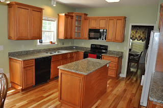 Our cabinets are finally installed!!!! We love them. Now we have a lot more work to do touching up where we "thought" the cabinets would be covering the paint... Oh well. Gotta put in the microwave, install a receptacle in the island, mud some holes, put in knobs on all the doors and drawers, finish the shoe molding, get the granite guys to come measure and install our counters...... ughhhhhh will this ever end? For tonight though, we are going to just sit back and enjoy the new cabinets. ahhhhhhh a moment of zen.